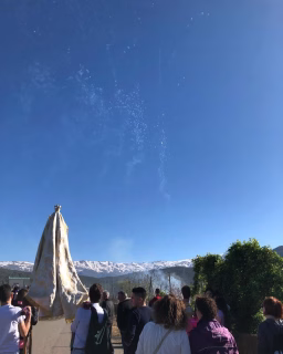 El municipio de Cogollos de Guadix se engalana para celebrar una de sus festividades más arraigadas, los esperados Días de la Virgen. Esta jornada, que se vive con gran devoción y alegría en la localidad, reúne a vecinos y visitantes en torno a la figura de su patrona. La imagen capturada hoy, bajo un cielo azul intenso y con las majestuosas cumbres nevadas de Sierra Nevada como telón de fondo, muestra uno de los momentos más emotivos: la procesión de la Virgen por las calles del pueblo. Pequeños fuegos artificiales o confeti salpican el aire, añadiendo un toque festivo a la solemnidad del acto. Es una oportunidad única para sumergirse en las tradiciones de este encantador rincón de la provincia de
