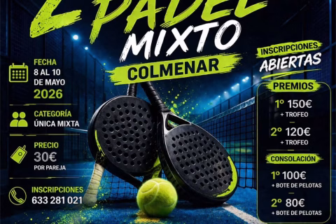 2º Torneo Pádel Mixto Colmenar. Del 8 al 10 de mayo de 2026. Precio: 30€ por pareja.