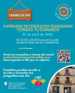 La Comarca de las Cinco Villas invita a todos sus vecinos a participar activamente en la II Jornada de Consultas Ciudadanas, un encuentro fundamental bajo el lema 'Conoce tu comarca'. Esta iniciativa busca fomentar la participación y el diálogo directo entre la administración comarcal y los ciudadanos, ofreciendo un espacio para que puedan expresar sus inquietudes, sugerencias y preguntas sobre el futuro de la región. El evento principal tendrá lugar el próximo 22 de abril de 2026, en horario de 12:00 a 14:00 horas, en la sede comarcal ubicada en la calle Justicia Mayor de Aragón, número 20, en la localidad de Ejea de los Caballeros. Es una oportunidad inmejorable para que los residentes de la comarca, incluyendo localidades cercanas como Marracos, se involucren en la gestión de su entorno. Los interesados tienen la posibilidad de enviar sus consultas previamente a través del correo electrónico protocolo@comarcacincovillas.es o utilizando el código QR disponible en el cartel, siendo el 21 de abril el último día para esta modalidad de envío anticipado. Además, aquellos que prefieran el contacto directo podrán acudir a la sede el día del evento para formular sus preguntas en persona. Esta jornada refuerza el compromiso de la Comarca de las Cinco Villas con la transparencia y la cercanía, creando un foro abierto para la construcción colectiva del futuro de la región. Para más información sobre eventos en la zona, puedes consultar la