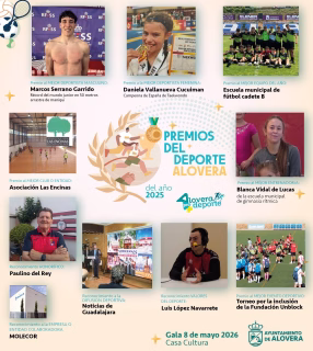 Alovera se prepara para una noche de reconocimiento y celebración del talento deportivo local con la esperada Gala de entrega de los Premios del Deporte de Alovera 2025. Este evento, que tendrá lugar el próximo 8 de mayo de 2026 en la Casa Cultura de la localidad, honrará a los atletas, equipos, clubes y entidades que destacaron por sus logros y valores durante el año 2025. El jurado ya ha deliberado y ha anunciado a los galardonados, entre los que se encuentran Marcos Serrano Garrido como mejor deportista masculino, Daniela Villanueva Cucuiman como mejor deportista femenino, y la Escuela municipal de fútbol cadete B como mejor equipo del año. La Asociación Las Encinas será reconocida como el mejor club o entidad, mientras que el Torneo por la inclusión de la Fundación Unblock se llevará el premio al mejor acontecimiento deportivo. Blanca Vidal de Lucas, de la escuela municipal de gimnasia rítmica, será homenajeada como mejor entrenadora, y Luis López Navarrete por los valores del deporte. Además, se otorgarán reconocimientos especiales a Noticias de Guadalajara por su difusión deportiva, a Paulino del Rey con un reconocimiento honorífico, y a Molecor como empresa colaboradora. Esta gala es una cita ineludible para la comunidad, que podrá aplaudir los éxitos y el esfuerzo de sus deportistas. Si buscas más