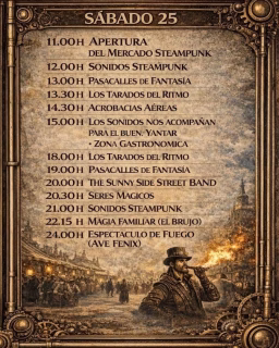 A lo largo del día, la música será una constante con los "Sonidos Steampunk" y las actuaciones de grupos como "Los Tarados del Ritmo" y "The Sunny Side Street Band". Los pasacalles de fantasía recorrerán el recinto, creando un ambiente mágico y envolvente. No faltarán las emocionantes acrobacias aéreas que dejarán a todos boquiabiertos. Para reponer fuerzas, la zona gastronómica ofrecerá una excelente oportunidad para el buen yantar, con propuestas culinarias para todos los gustos.