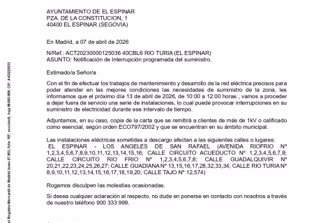 Interrupción del suministro eléctrico para efectuar mejoras en la red de distribución en Los Ángeles de San Rafael. Afecta a las siguientes vías y números: Avenida Riofrío (1-16), Calle Circuito Acueducto (1-8), Calle Circuito Río Frío (1-8), Calle Guadalquivir (20-27), Calle Guadiana (13, 15, 16, 17, 28, 32, 33, 34), Calle Río Turia (8-20), Calle Tajo (12, 574).