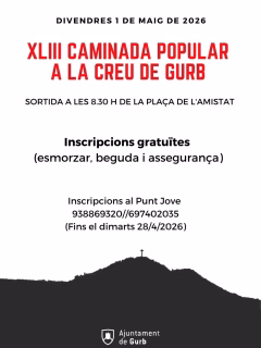 El Ayuntamiento de Gurb, en la provincia de Barcelona, invita a todos los vecinos y visitantes a participar en la XLIII Caminada Popular a la Creu de Gurb, un evento ya tradicional en el calendario local. Esta popular marcha, que celebra su cuadragésimo tercera edición, es una excelente oportunidad para disfrutar del aire libre y la compañía, explorando los bellos paisajes que rodean esta localidad de Cataluña. La caminata está programada para el viernes 1 de mayo de 2026, con salida a las 8:30 de la mañana desde la céntrica Plaça de l'Amistat. La participación en esta actividad deportiva y social es completamente gratuita, lo que la hace accesible para todos los públicos. Además, para garantizar una experiencia cómoda y segura, la inscripción incluye un desayuno para reponer energías, una bebida refrescante y un seguro para los participantes. Es una iniciativa perfecta para empezar el mes de mayo de una forma activa y saludable. Las inscripciones se pueden realizar en el Punt Jove de Gurb, y el plazo finaliza el martes 28 de abril de 2026. No pierdas la oportunidad de unirte a esta jornada de convivencia y deporte en uno de los entornos naturales más emblemáticos de la zona. Para más información sobre