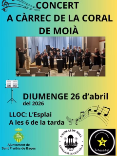 La música es un lenguaje universal que une generaciones, y en Sant Fruitós de Bages, la agenda cultural siempre ofrece propuestas para todos los gustos. Este próximo domingo, 26 de abril de 2026, los amantes de las melodías corales tienen una cita ineludible. A partir de las 18:00 horas, el escenario de L'Esplai acogerá la esperada actuación de la Coral de Moià, un grupo que promete deleitar al público con su repertorio.
