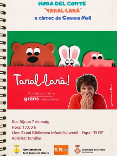 El Ajuntament de Sant Jaume de Llierca, en la provincia de Girona, invita a todas las familias a disfrutar de una tarde inolvidable con la "Hora del conte: Taral·larà!". Esta encantadora sesión de cuentacuentos, a cargo de la talentosa Gemma Moll, promete llenar el ambiente de risas, música e imaginación, ofreciendo una experiencia mágica tanto para los más pequeños como para los adultos que los acompañen.