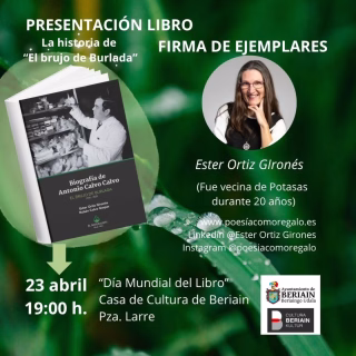 Comunidad Foral de Navarra, con un evento literario de gran interés. El próximo 23 de abril de 2026, la Casa de Cultura de Beriain, ubicada en la Pza. Larre, acogerá la presentación y firma del libro "El brujo de Burlada". Esta obra, una biografía fascinante de Antonio Calvo Calvo (1944-2025), ha sido escrita por Ester Ortiz Gironés y Rubén Calvo Gaspar. Los asistentes tendrán la oportunidad única de conocer a Ester Ortiz Gironés, quien, además de coautora, fue vecina de Potasas durante dos décadas, aportando una perspectiva personal y cercana a la vida de este singular naturalista. La cita es a las 19:00 horas, un momento perfecto para sumergirse en una historia apasionante y descubrir los detalles de una vida dedicada a la naturaleza. Este acto no solo es una presentación, sino también una oportunidad para adquirir un ejemplar del libro y obtener una firma personalizada de la autora. Es una excelente propuesta cultural que enriquece la