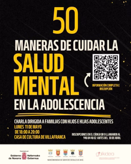 El Ayuntamiento de Villafranca, en la Comunidad Foral de Navarra, ha organizado una interesante charla enfocada en el bienestar de los jóvenes. Bajo el título '50 Maneras de cuidar la salud mental en la adolescencia', esta sesión está diseñada para ofrecer a padres y madres herramientas prácticas y sencillas para apoyar a sus hijos e hijas durante esta etapa crucial. La salud mental en la adolescencia es un tema de creciente importancia, y esta iniciativa busca dotar a las familias de recursos efectivos. La ponencia será impartida por Galkidea, un centro especializado en psicología y acompañamiento familiar, garantizando un enfoque profesional y cercano. La cita es el lunes 11 de mayo de 2026, en la Casa de Cultura de Villafranca, con un horario de 18:00 a 20:00 horas. La participación es completamente gratuita, aunque es necesario inscribirse previamente para asegurar la plaza. Las inscripciones pueden realizarse llamando al 948 84 48 02, a través del formulario disponible en la biografía del ayuntamiento o escaneando el código QR que figura en la publicación. Es importante tener en cuenta que el plazo para inscribirse finaliza el jueves 30 de abril de 2026, y se requiere un grupo mínimo de 12 personas para que la charla se lleve a cabo. No pierdas la oportunidad de aprender más sobre cómo fomentar un entorno saludable para tus adolescentes en