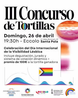 Santa Pola se prepara para una de sus citas más sabrosas y significativas del año: el III Concurso de Tortillas, un evento que trasciende lo culinario para convertirse en un punto de encuentro para la comunidad. Este año, la propuesta, ya consolidada en la agenda local, promete una tarde llena de sabor, camaradería y un fuerte mensaje de inclusión. La cita tendrá lugar el domingo, 26 de abril de 2026, a partir de las 19:30 horas, en el conocido Pub Eccolo, situado en la C/ Alejo Bonmatí, 23. Este concurso no solo celebra la gastronomía, sino que también se enmarca en la conmemoración del Día Internacional de la Visibilidad Lésbica, añadiendo una capa de significado social y reivindicación. Los asistentes podrán disfrutar de una degustación de las tortillas participantes, mientras un jurado en directo y un sistema de votaciones “mejores que las de Eurovisión” deciden cuál es la mejor creación culinaria. La tortilla ganadora se llevará un premio en metálico de 100€, un incentivo más para que los cocineros y cocineras de Santa Pola demuestren su arte. Este evento es una excelente oportunidad para disfrutar de la gastronomía local, participar en una actividad divertida y apoyar un ambiente abierto e inclusivo. La iniciativa, impulsada por el Ayuntamiento de Santa Pola, en colaboración con entidades como Entendemos y la Generalitat Valenciana, subraya el compromiso de la localidad con la diversidad y la convivencia. Si buscas