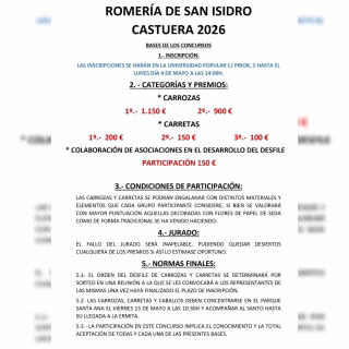 Las inscripciones para los concursos de carrozas y carretas, que ofrecen premios de hasta 1.150 euros para las carrozas y 200 euros para las carretas, se podrán realizar en la Universidad Popular, en C/ Prior, 2, hasta el lunes 4 de mayo de 2026 a las 14:00 horas. Las bases detallan que se valorará especialmente la decoración tradicional con flores de papel de seda. Además, se contempla una categoría de colaboración para asociaciones, con una participación de 150 euros. La Romería de San Isidro es una cita ineludible en la