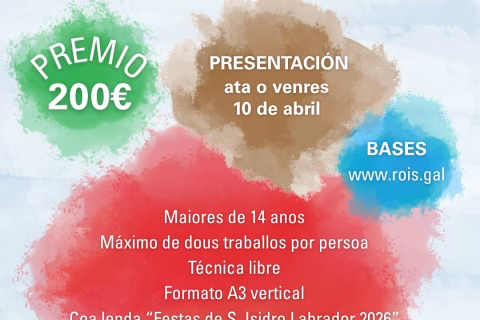 Concurso para crear la imagen oficial de las fiestas patronales de Santo Isidro 2026. Participantes mayores de 14 años, técnica libre, formato vertical A3. Obras originales (no se admiten creaciones con inteligencia artificial). Premio: 200€ y el cartel ganador será la imagen oficial. Presentación digital en inscricions@rois.gal o entrega presencial en el Concello.
