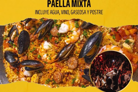 Comida popular: Paella mixta, agua, vino, gaseosa y postre. Después tardeo.