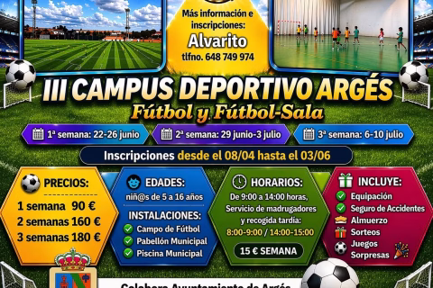 Campus Deportivo Argés de Fútbol y Fútbol-Sala. 6-10 julio. Niños 5-16 años. Precio 180€ (3 semanas).
